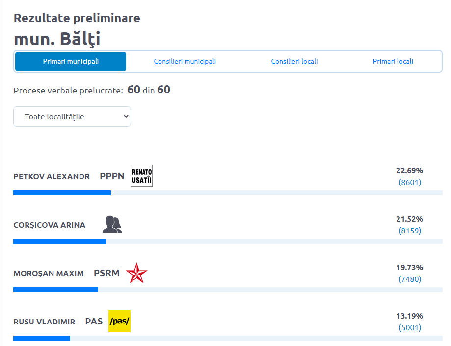 În municipiul Bălți va avea loc turul II pentru funcția de primar general. Lupta finală se va între Alexandr Petkov, candidatul Partidului Nostru, care a obținut 22,69% sau 8 601 voturi, și Arina Corșicova, candidat independent, care a acumulat 21,52% sau 8 159 de voturi.