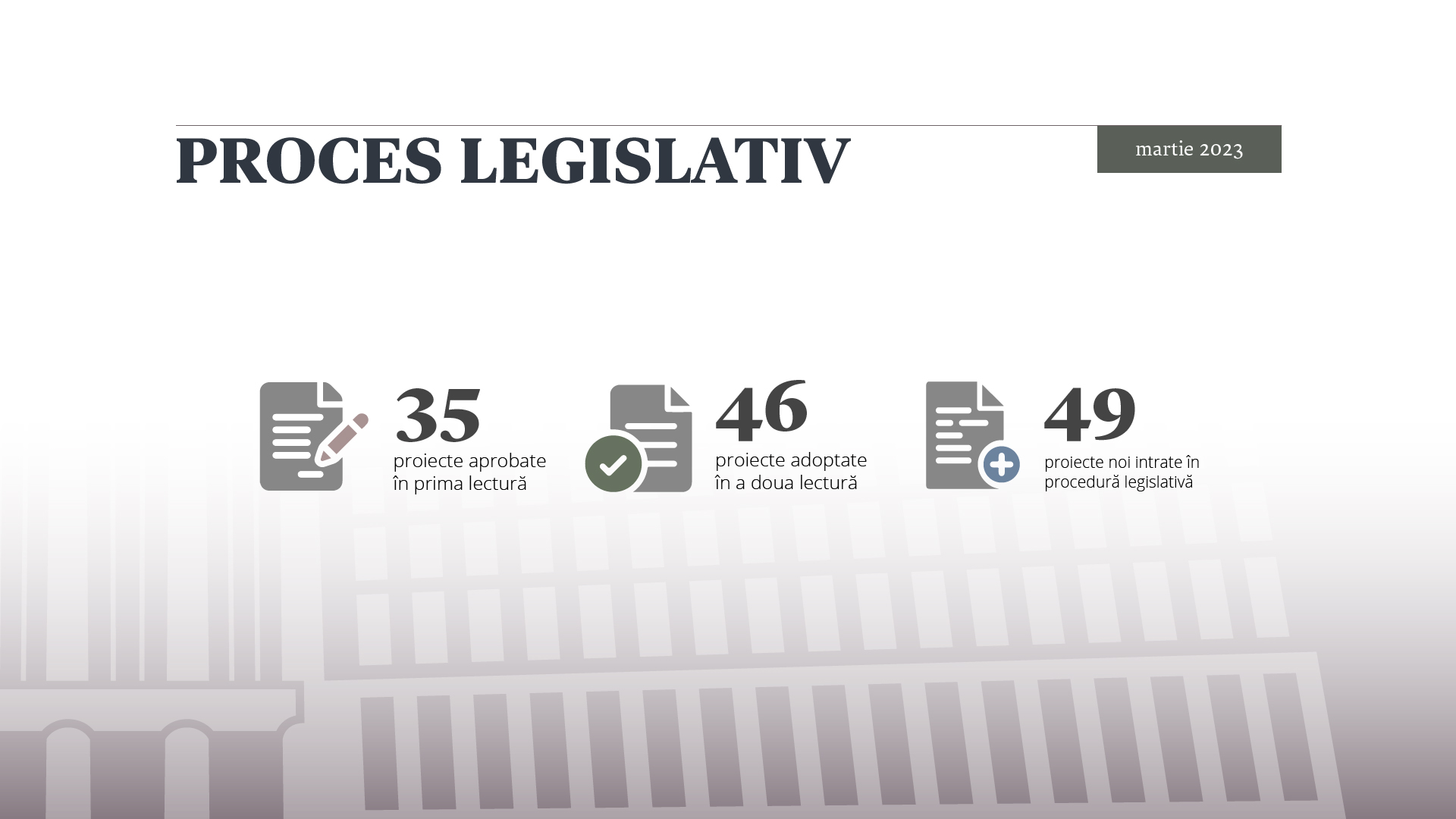 În luna martie, în plenul Parlamentului a fost votate, în prima sau a doua lectură, 81 de proiecte de acte normative. În aceeași perioadă, au intrat în procedură legislativă 49 de proiecte.