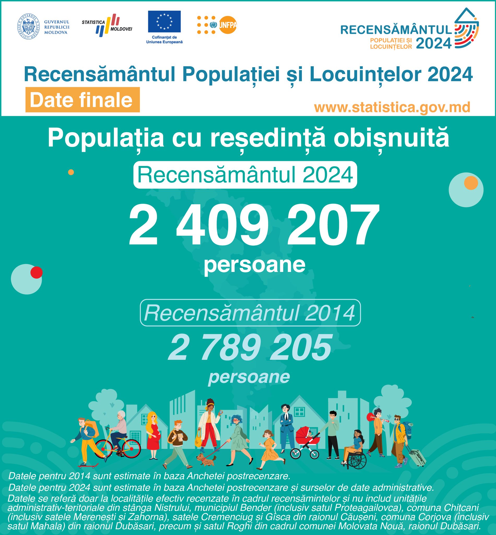 Biroul Național de Statistică informează că, conform rezultatelor finale ale Recensământului populației și locuințelor (RPL) din 2024, numărul populației cu reședință obișnuită2 la data de referință a recensământului (8 aprilie 2024) a constituit 2 409,2 mii persoane.