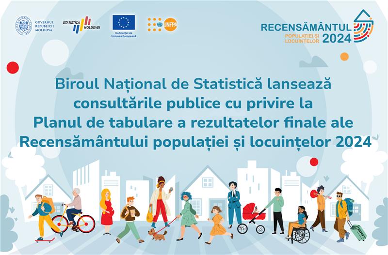 Biroul Național de Statistică (BNS) lansează consultările publice cu privire la Planul de tabulare a rezultatelor finale ale Recensământului populației și locuințelor (RPL) din anul 2024, ce urmează a fi utilizat la diseminarea datelor. Consultările publice se vor desfășura online, prin completarea unui chestionar la linkul https://bit.ly/Consultareplantabulare, până la data de 7 mai 2025. La completarea chestionarului, participanții la consultările publice au posibilitate de a expune comentariile și propunerile lor pe marginea proiectului Planului de tabulare a rezultatelor finale ale RPL 2024.