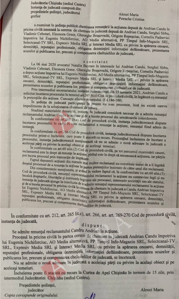 Pe 15 ianuarie 2021, politicianul a solicitat însă încetarea procesului, renunțând la pretențiile din acțiune. Prin urmare, Judecătoria Chișinău, sediul Centru, i-a acceptat renunțul și a dispus încetarea procesului. Deocamdată, nu se știe ce l-a făcut pe acesta să se răzgândească.