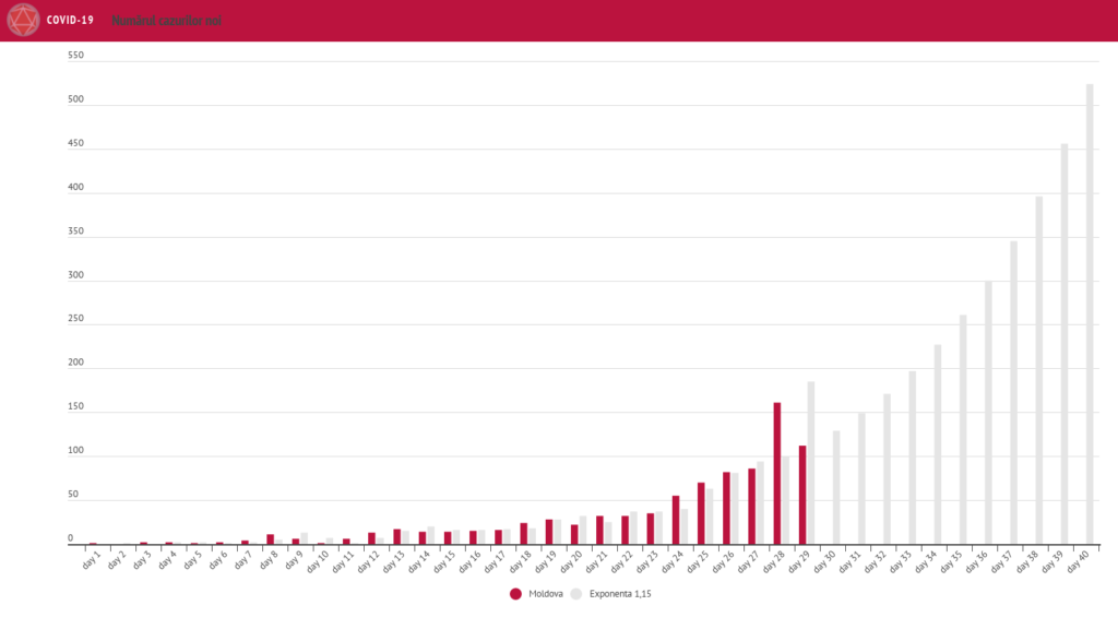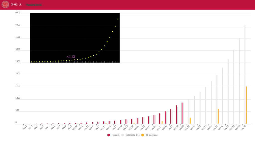 În total, în Republica Moldova sunt înregistrate 864 de cazuri de infectare cu noul coronavirus (05 aprilie 2020), iar în lipsa unor măsuri radicale, matematic vorbind, ne putem aștepta la peste 200.000 de cazuri noi în următoarele 30 de zile (864*(2,5)6=210 938). Putem presupune că densitatea populației, coeficientul masei critice infectate, vârsta medie a populației și lipsa orașelor aglomerate nu vor permite ca Republica Moldova să se alinieze la rezultatele îngrozitoare din țările europene.