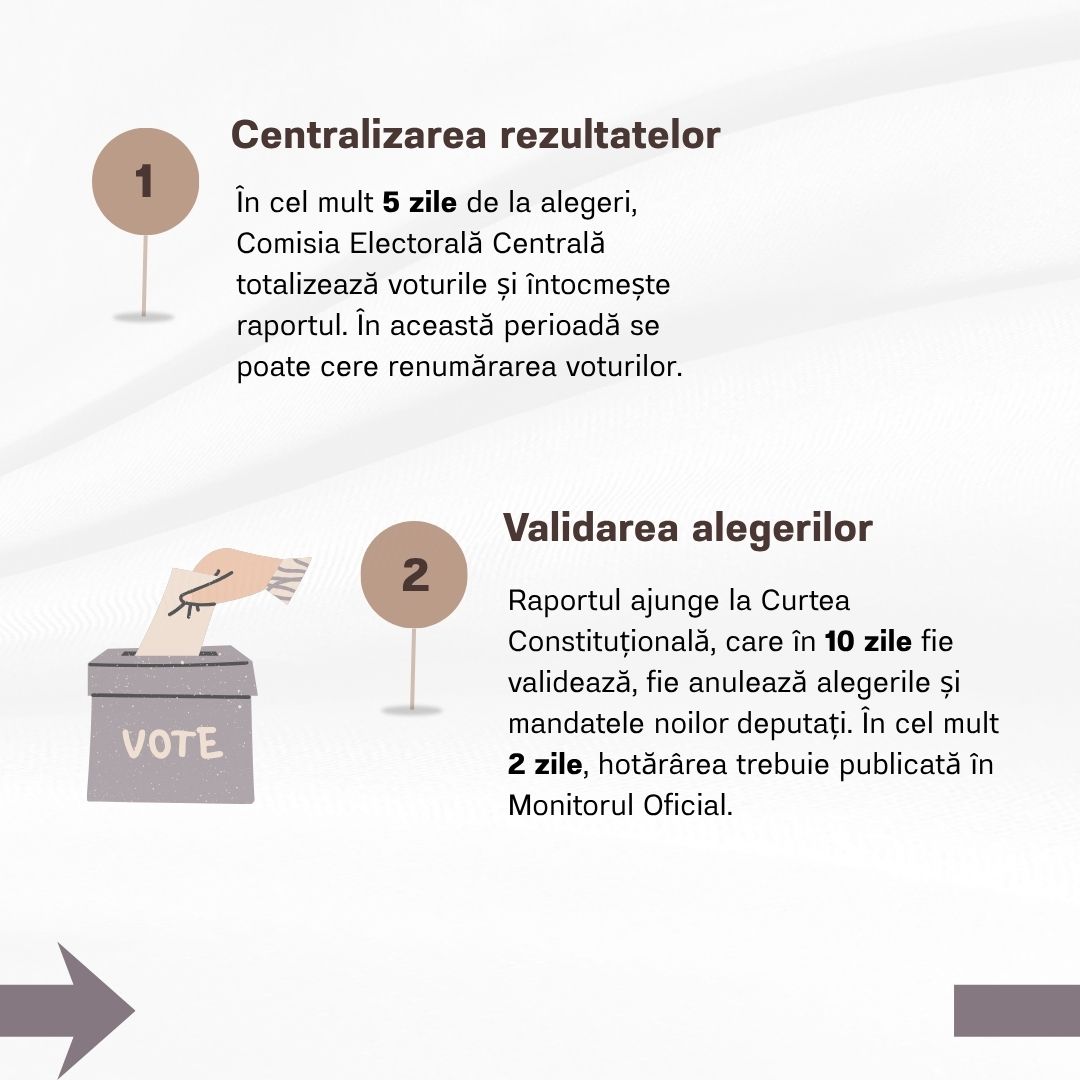 Astfel, Comisia Electorală Centrală va totaliza rezultatele scrutinului în cel mult 5 zile. Ulterior, alegerile urmează să fie validate de Curtea Constituțională în cel mult 10 zile.