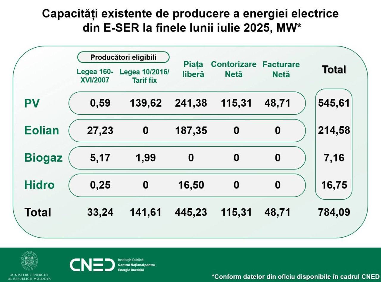 La sfârșitul lunii iulie 2025, capacitatea totală instalată de energie din surse regenerabile (E-SER) a atins impresionanta valoare de 784,09 MW – o creștere de 204,7 MW față de finele anului trecut, arată datele de la Centrul Național pentru Energie Durabilă.