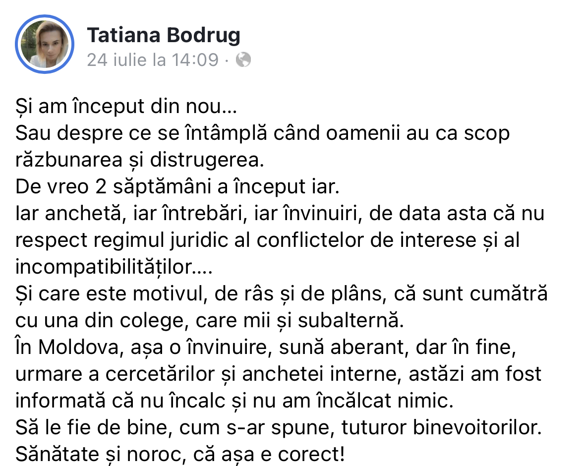 „Şi am început din nou…. Sau ce se întâmplă când oamenii au ca scop răzbunarea şi distrugerea. De vreo 2 săptămâni a început iar. Iar anchetă, iar întrebări, iar învinuiri, de data aceasta că nu respect regimul juridic al conflictelor de interese şi al incompatibilităţilor. Şi care este motivul, de râs şi de plâns, că sunt cumătră cu una din colege, care mii şi subalternă. În Moldova, aşa o învinuire, sună aberant, dar, în fine, urmare a cercetărilor şi a anchetei interne, astăzi am fost informată că nu încalc şi nu am încălcat nimic. Să le fie de bine, cum s-ar spune, tuturor binevoitorilor. Sănătate şi noroc că aşa e corect”, a scris Tatiana Bodrug pe facebook.