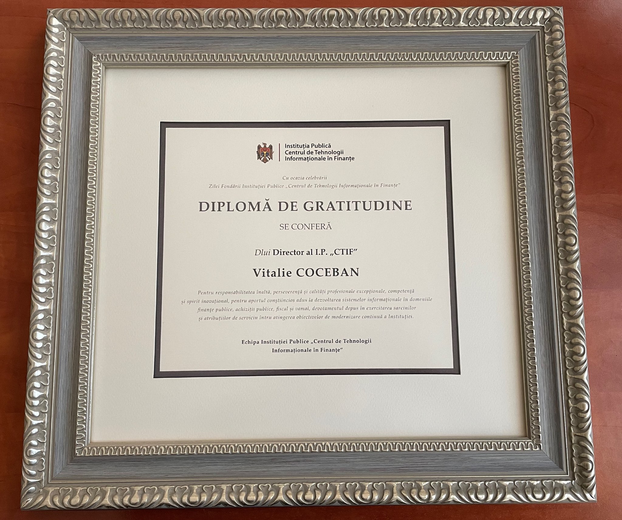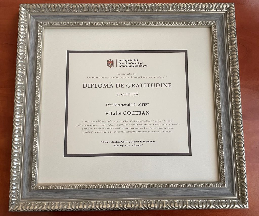 Tot în contextul celebrării sărbătorii instituționale, Directorul I.P, I.P. „CTIF”, Vitalie Coceban, a fost menționat cu diplomă de gratitudine de către echipa Instituției, în semn de înaltă, perseverență și calități profesionale excepționale, competență și spirit inovațional, pentru aportul conștiincios adus la dezvoltarea sistemelor informaționale în domeniile finanțelor publice, fiscal, vamal și achiziții publice, devotamentul depus în exercitarea sarcinilor și atribuțiilor de serviciu întru atingerea obiectivelor de modernizare continuă a Instituției.