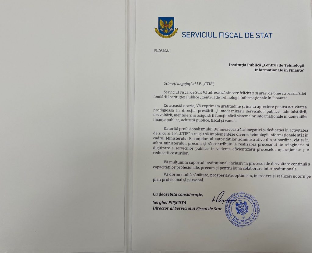 La 1 octombrie, Instituția Publică „Centrul de Tehnologii Informaționale în Finanțe” (I.P. „CTIF”) a marcat 3 ani de la data fondării. Cu acest prilej, Serviciul Fiscal de Stat, a adresat un mesaj de felicitare, în care și-a exprimat gratitudinea și aprecierea pentru activitatea prodigioasă în direcția prestării și modernizării serviciilor publice, administrării, dezvoltării, menținerii și asigurării funcționării sistemelor informaționale în domeniile: finanțe publice, achiziții publice, fiscal și vamal.