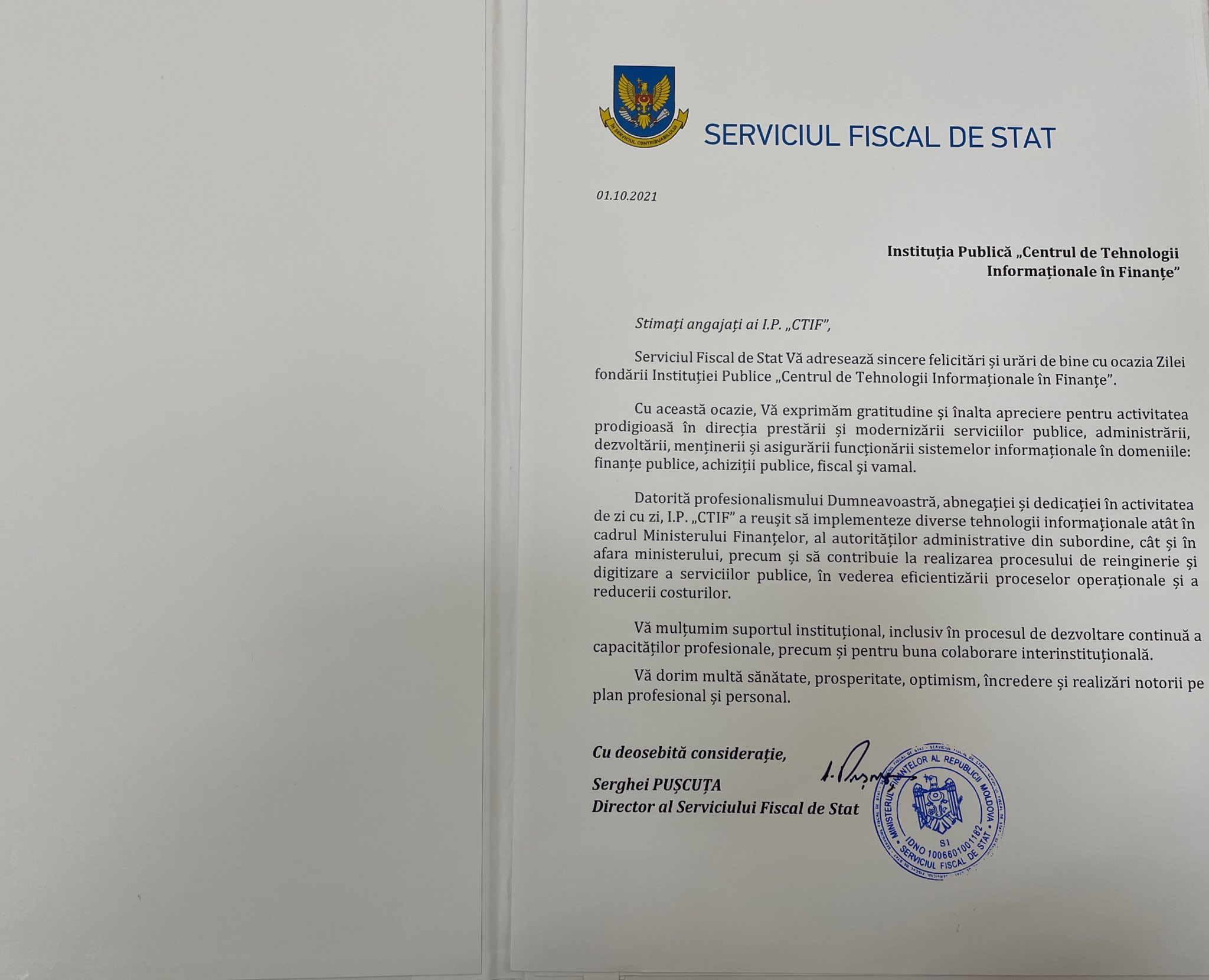 În mesaj se menționează: „ Datorită profesionalismului, abnegației și dedicației în activitatea de zi cu zi, I.P. „CTIF” a reușit să implementeze diverse tehnologii informaționale atât în cadrul Ministerului Finanțelor, al autorităților administrative din subordine, cât și în afara ministerului, precum și să contribuie la realizarea procesului de reinginerie și digitizare a serviciilor publice, în vederea eficientizării proceselor operaționale și a reducerii costurilor”.