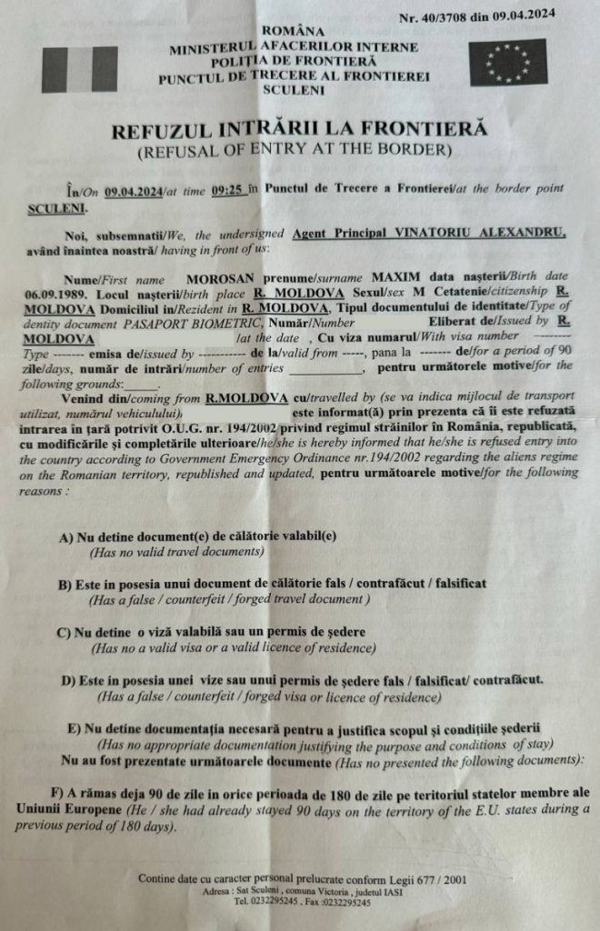 Totodată, Maxim Moroșan a spus că, într-o discuție privată cu câțiva reprezentanți ai poliției de frontieră, i s-a comunicat că toată această poveste cu interdicția de intrare este exclusiv politică, în care ar fi implicat Renato Usatîi, fostul primar de Bălți.