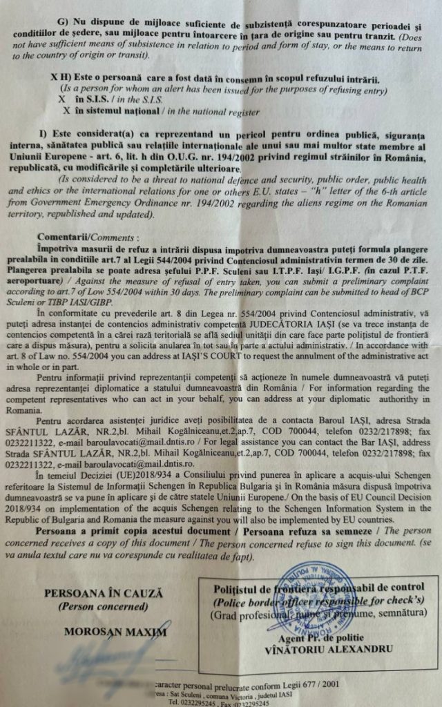 „Timp de o oră și jumătate m-au ținut la acest punct de control, pentru ca până la urmă să mi se spună că intrarea în România a fost interzisă.