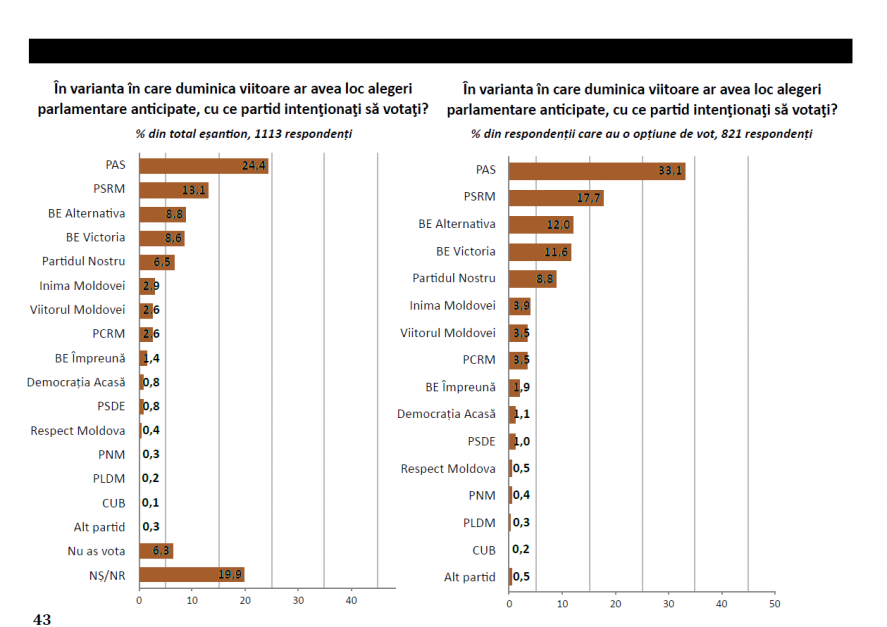 Partidul Acțiune și Solidaritate ar obține 24,4%, Partidul Socialiștilor din Republica Moldova – 13,1%, Blocul Alternativa – 8,8%, Blocul „Victorie” – 8,6%, Partidul Politic Partidul Nostru – 6,5%.