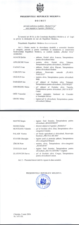 Șefa statului le-a mulțumit celor peste 6000 de persoane care au participat la campania de împădurire din această primăvară și tuturor celor din anul precedent – silvicultori, muncitori, voluntari, reprezentanți ai comunității ecologiste, tuturor cetățenilor care au grijă de natură. Președinta Maia Sandu a subliniat că, în semn de recunoștință, a decis să înmâneze mai multor angajați ai Agenției „Moldsilva” și întreprinderilor silvice medalia „Meritul Civic” pentru contribuția pe care au avut-o la protejarea naturii. Șefa statului a punctat că în anul 2023 au fost plantate șapte mii de hectare de pădure, mult mai mult decât în trecut și speră să fie continuată împădurirea cu ritmuri accelerate.