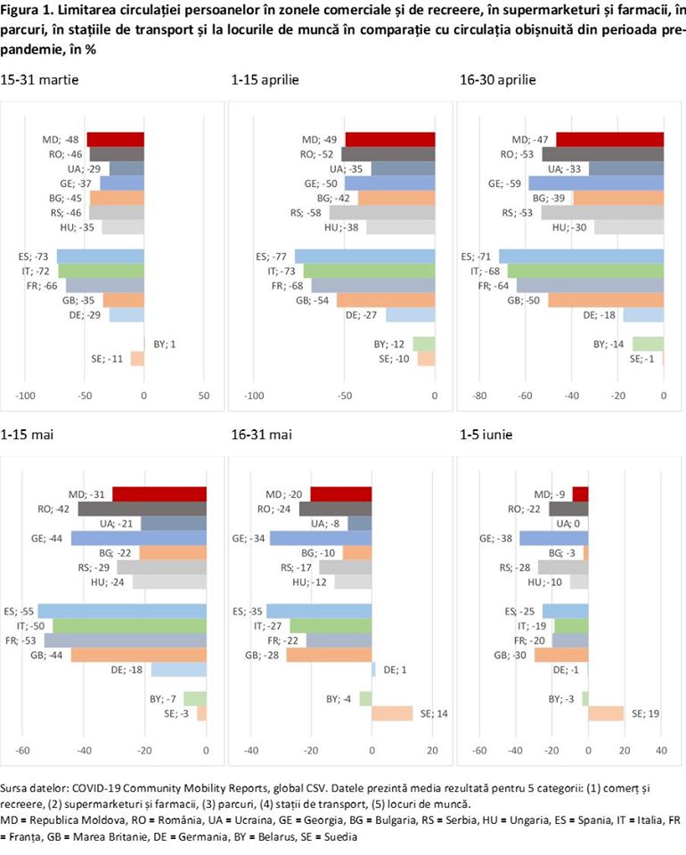 În martie și aprilie moldovenii, de rând cu românii, și-au redus circulația în zonele publice la jumătate. Mai mult reușeau doar cei puternic afectați: italienii și spaniolii, care au limitat circulația cu 70%, și francezii, cam tot pe acolo. Spre sfârșitul lui aprilie și în mai georgienii — susținuți de un pachet de măsuri de sprijin din partea guvernului de aproape 7% din PIB (pentru comparație, în Moldova e declarativ 1,2%, iar real probabil vreo 0,3%) — au început să se izoleze mai mult.