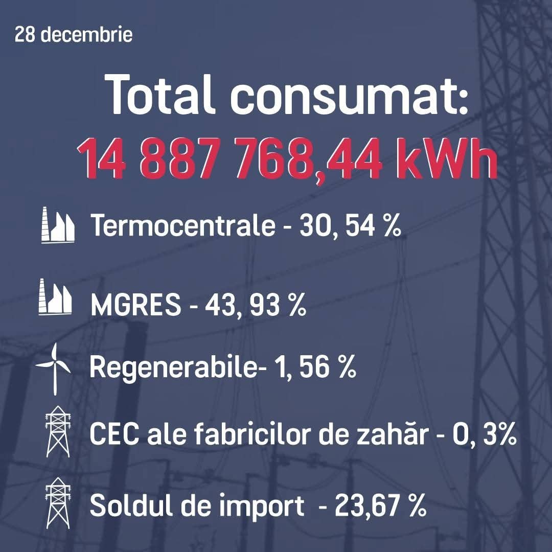 Potrivit Ministerului Energiei, producerea energiei electrice în această perioadă a fost dominată de MGRES, cu un randament de producție între 45-54%. Alte surse importante de energie includ termocentralele din Chișinău și Bălți, cu o contribuție semnificativă de 27-33%, și sursele regenerabile, care au furnizat un aport între 0,5-2%. De asemenea, centralele electrice de cogenerare ale fabricilor de zahăr au produs constant aproximativ 0,3% din totalul energiei disponibile, cu un sold de import al energiei electrice pe segmentul MD-UA-RO între 11-24%.