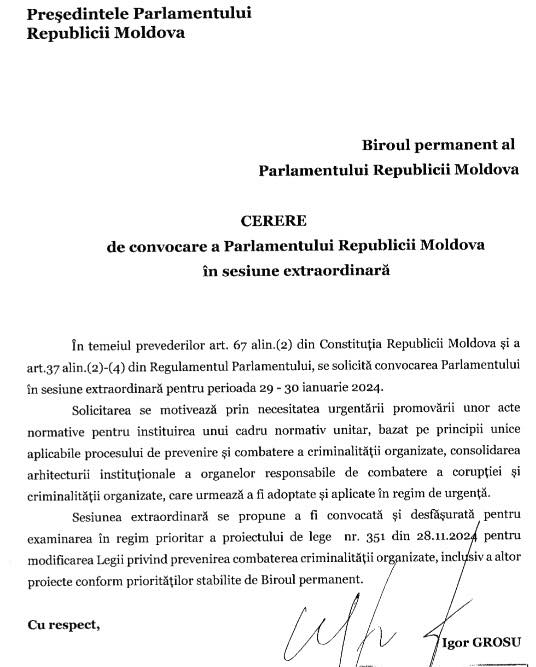 Igor Grosu, președintele Parlamentului, a semnat cerere privind convocarea sesiunii extraordinare a Parlamentului pe 29-30 ianuarie.