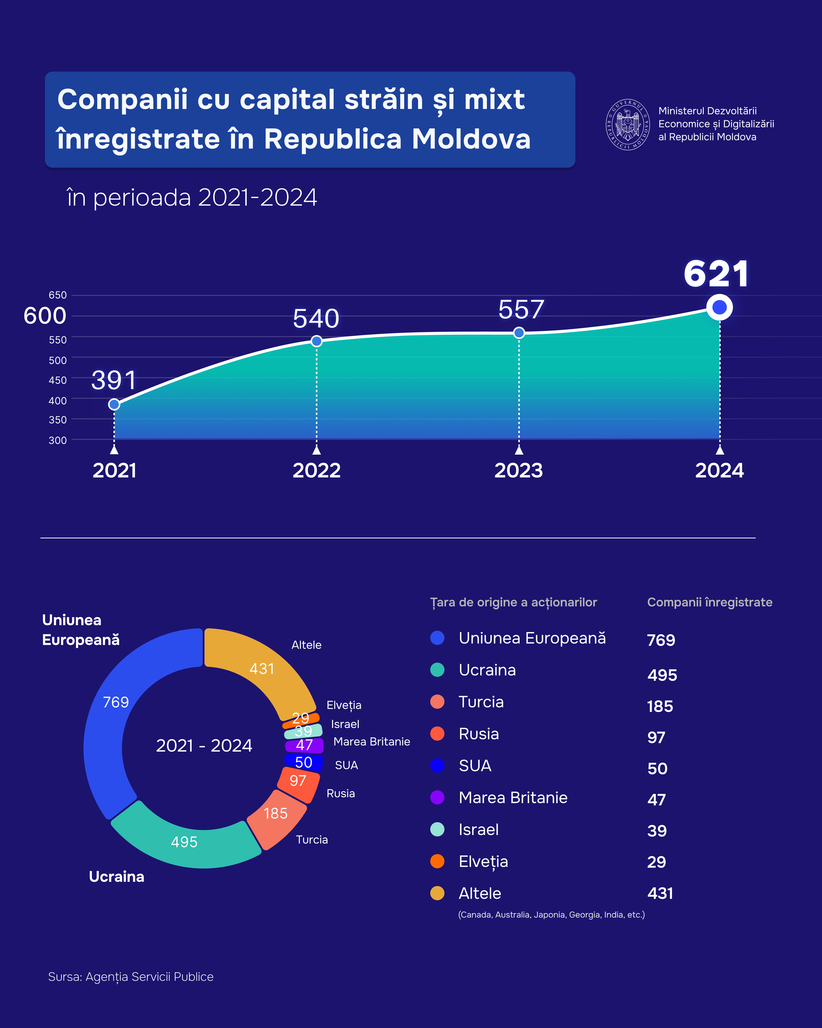 2.109 companii cu capital străin și mixt au fost înregistrate în Republica Moldova în perioada 2021-2024. Datele Agenției Servicii Publice arată o creștere treptată a acestui indicator în ultimii patru ani.