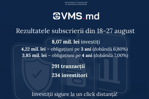 Subscrierea pentru emisiunea de valori mobiliare de stat, desfășurată prin platforma eVMS.md în perioada 18–27 august 2025, s-a încheiat.