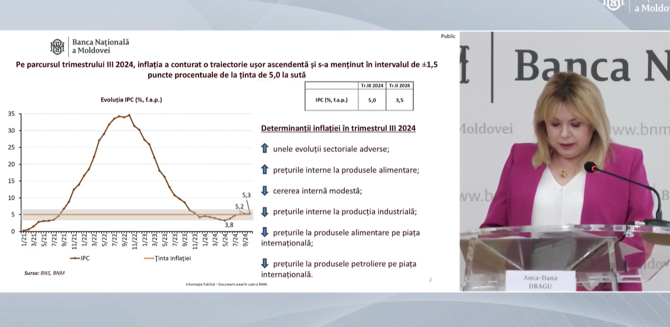 Guvernatoarea Băncii Naționale a Moldovei, Anca Dragu, a prezentat astăzi cel de-al patrulea Raport asupra inflației din anul curent. Datele arată că, în premieră, după opt ani, rata anuală a inflației s-a menținut și se menţine în interiorul intervalului de variaţie de ± 1.5 puncte procentuale de la ţinta de 5.0 la sută pe o durată de 12 luni consecutive.