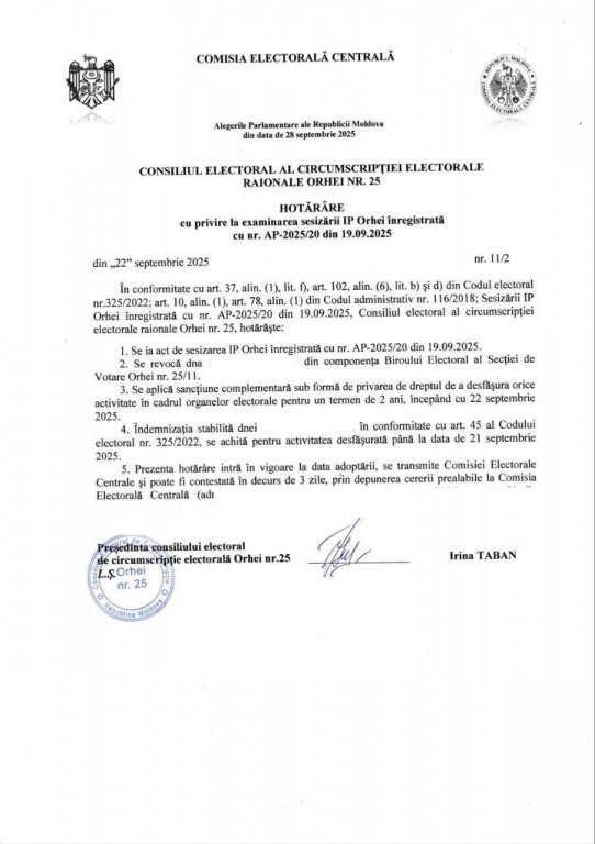 Primarul municipiului Orhei, Tatiana Cociu, acuză Comisia Electorală Raională de circumscripție Orhei, instituită de Comisia Electorală Centrală, de încălcarea deschisă a legii, prin excluderea fără temei a reprezentanților desemnați de primărie din birourile electorale ale secțiilor de votare.