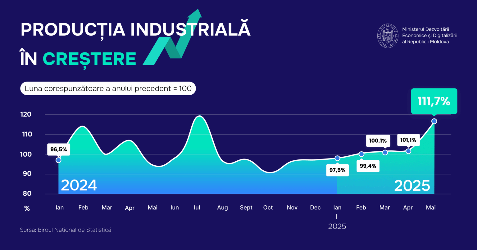 Industria Republicii Moldova continuă să dea semne de revigorare. În luna mai 2025, producția industrială a înregistrat o creștere de 11,7% față de aceeași lună a anului trecut, menținând tendința pozitivă din aprilie.
