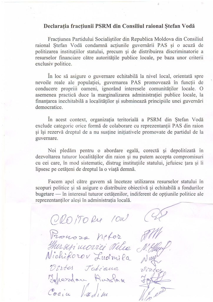 Fracțiunea Partidului Socialiștilor din Republica Moldova din Consiliul raional Ștefan Vodă condamnă acțiunile guvernării PAS și o acuză de politizarea instituțiilor statului, precum și de distribuirea discriminatorie a resurselor financiare către autoritățile publice locale, pe baza unor criterii exclusiv politice.