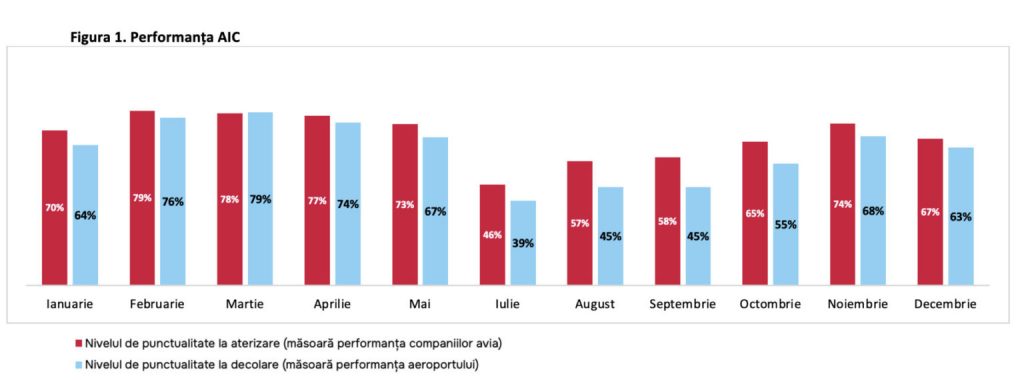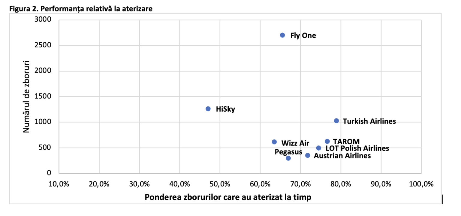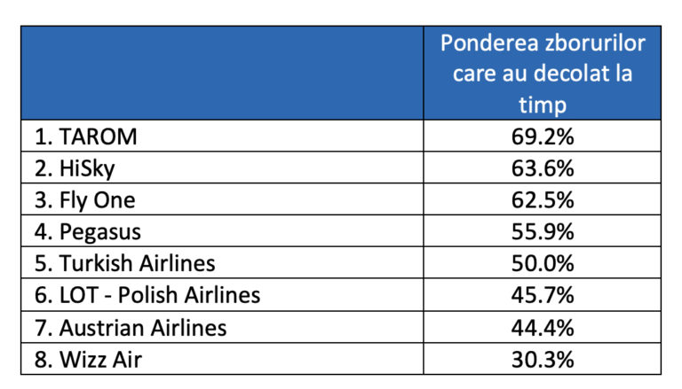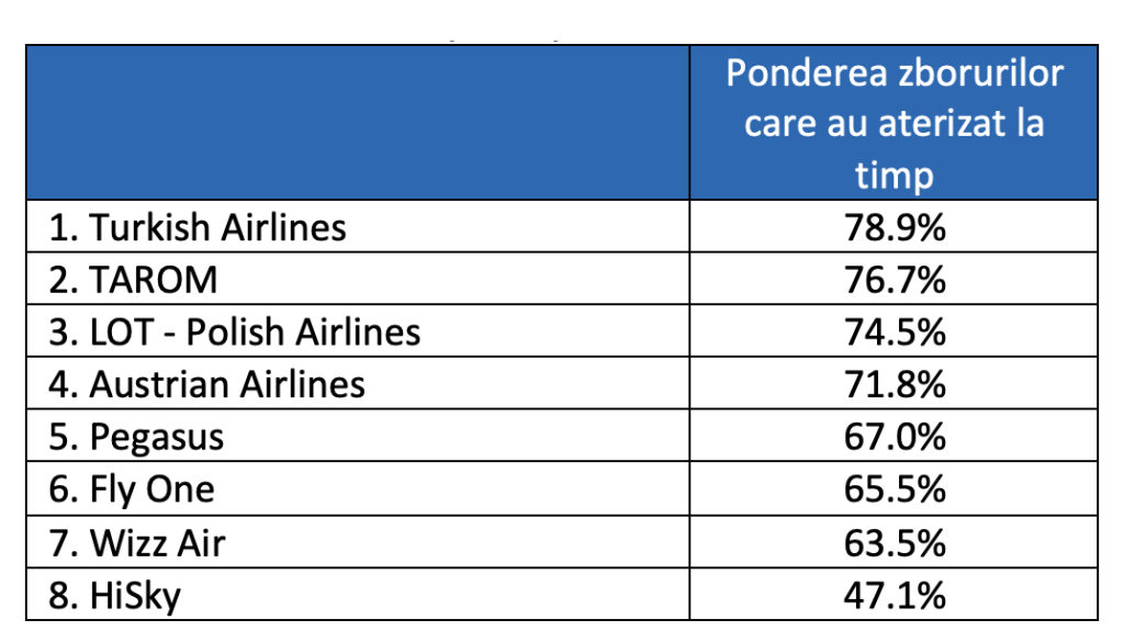 Cele mai punctuale companii aeriene la aterizare au fost Turkish Airlines (78,9%), TAROM (76,7%) și LOT Polish Airlines (74,5%), conform datelor prezentate în tabelul 1. Iar la decolare, cele mai punctuale companii au fost TAROM (69,2%), HiSky (63,6%) și Fly One (62,5%), conform (tabelul 2).