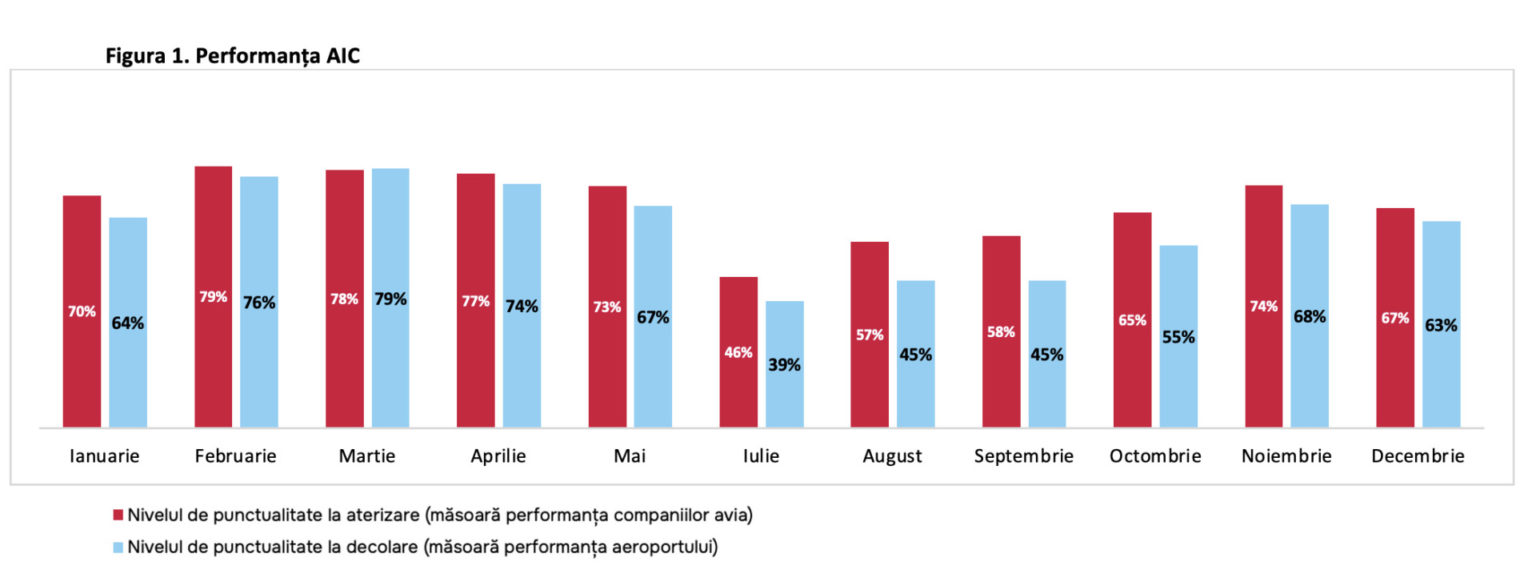În perioada ianuarie – decembrie 2024, au fost monitorizate aproximativ 15.000 de zboruri operate pe Aeroportul Internațional Chișinău. Performanțele înregistrate indică faptul că 65,3% dintre toate zborurile planificate au aterizat la timp[1], iar 58,4% dintre zboruri au decolat la timp. Cea mai bună performanță a fost înregistrată în luna martie, când 78,2% dintre zboruri au aterizat la timp, iar 78,6% au decolat la timp. Pe când, cele mai slabe rezultate s-au înregistrat în luna iulie, când doar 45,8% dintre zboruri au aterizat la timp și 38,5% au decolat la timp.