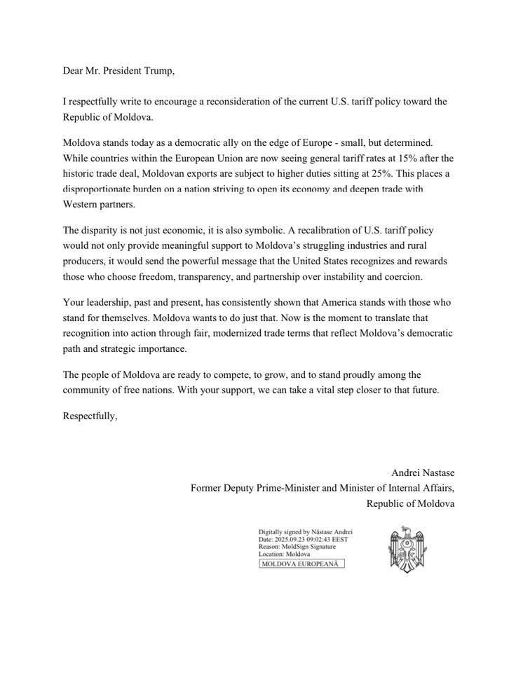 Андрей Нэстасе, независимый кандидат на должность депутата, направил официальное письмо Президенту Соединённых Штатов Америки Дональду Трампу, в котором обратился с просьбой о пересмотре торговых тарифов, применяемых к Республике Молдова, с тем чтобы они были приведены в соответствие с тарифами, действующими в отношении Европейского Союза.