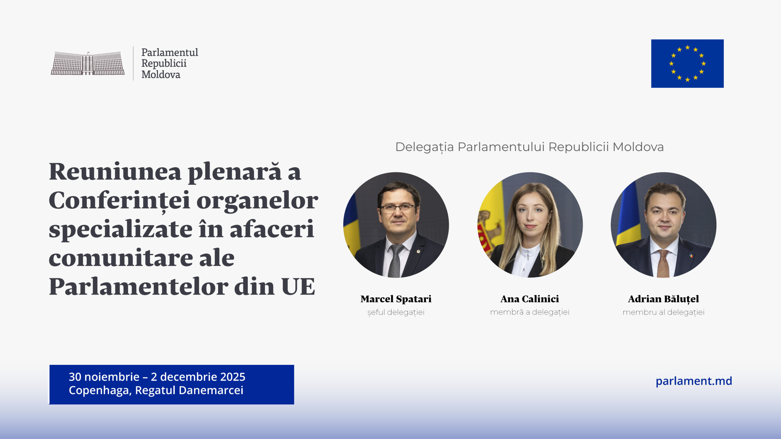Делегация Парламента Республики Молдова примет участие в 74-м пленарном заседании Конференции специализированных парламентских органов по делам ЕС парламентов Европейского союза (COSAC). Заседание пройдет с 30 ноября по 2 декабря в Копенгагене, Дания.