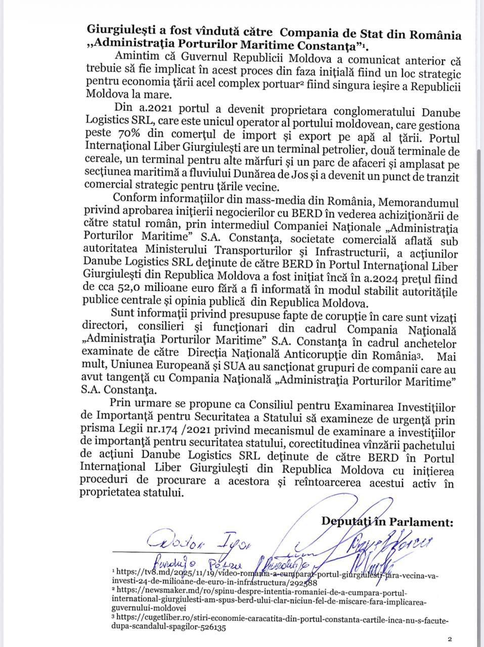 «Вместе с коллегами зарегистрировали законодательную поправку о возвращении Международного свободного порта «Джурджулешты» в собственность государства.