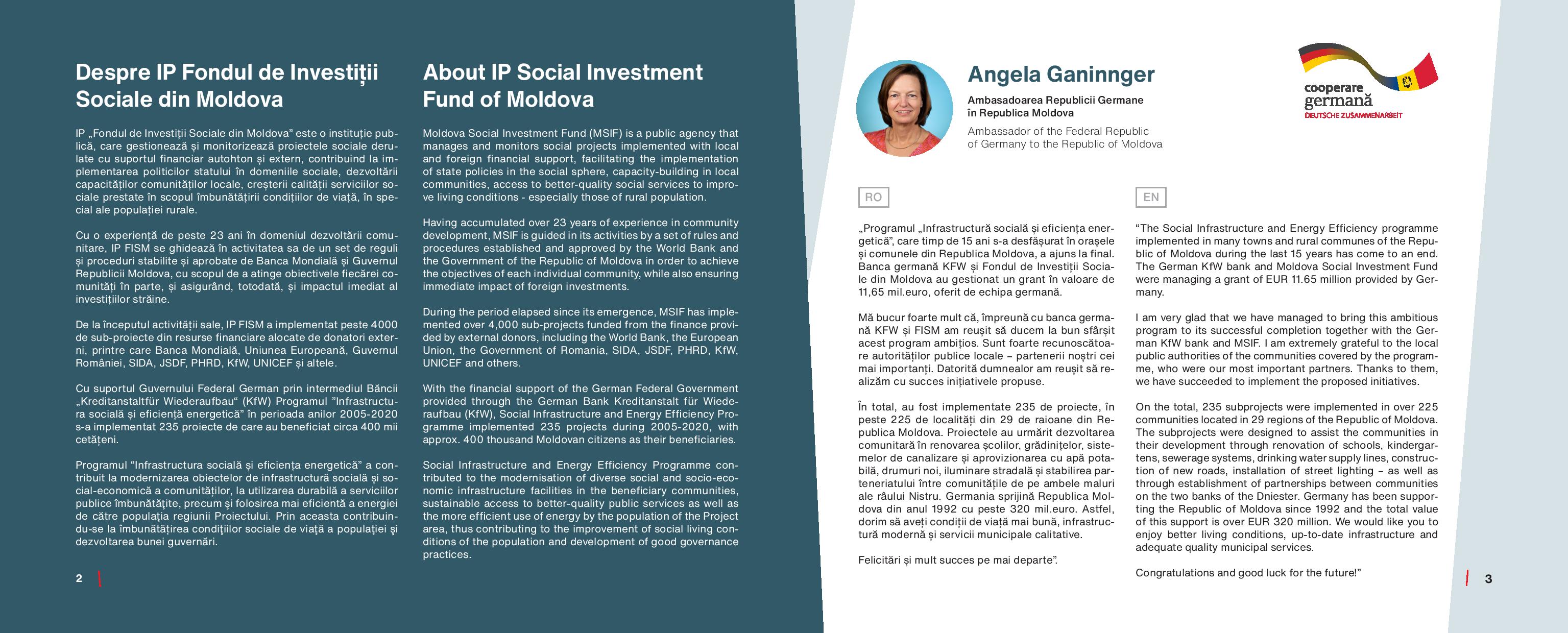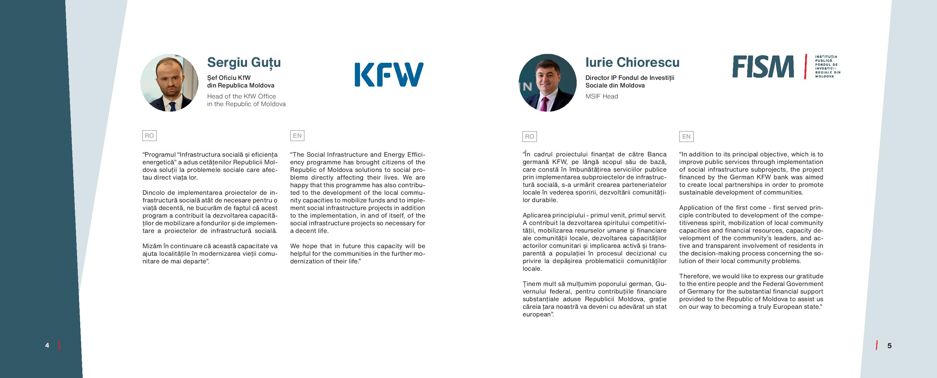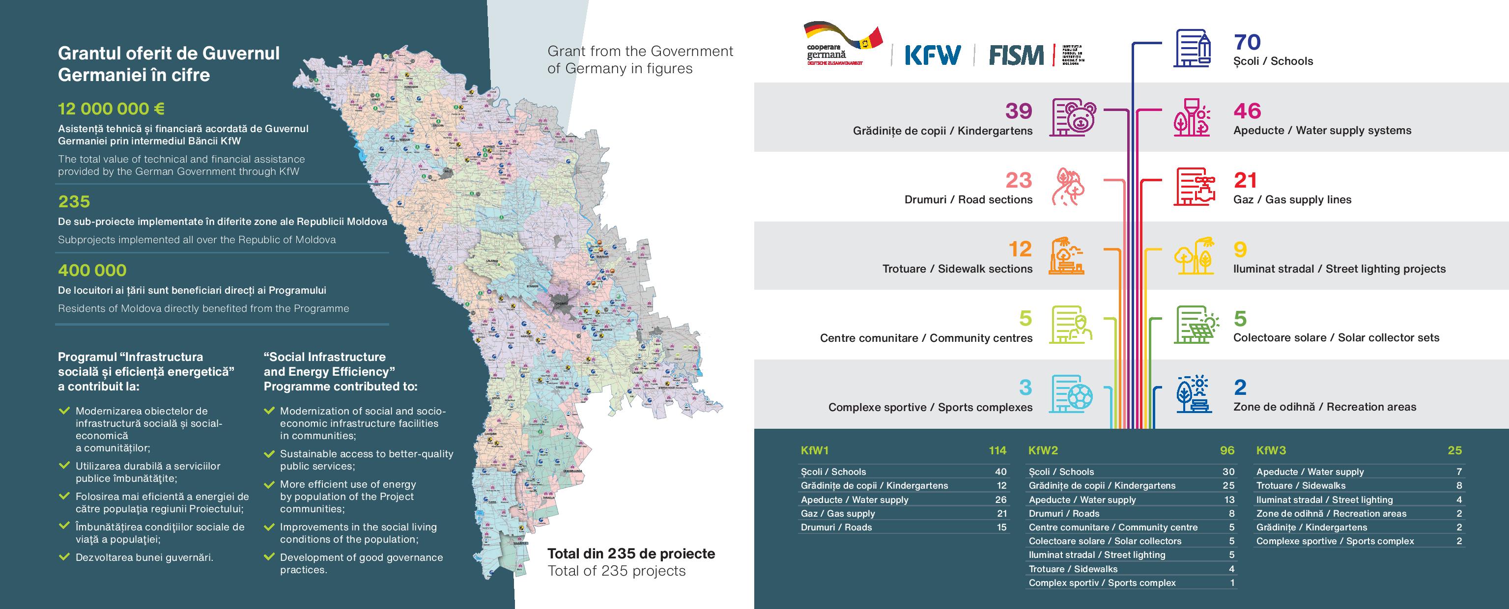 В Республике Молдова издан фотоальбом с наиболее яркими социальными проектами, реализованными ИП «Фонд социальных инвестиций Молдовы» (IP FISM) при поддержке правительства Германии через Банк KfW. Они были реализованы по всей стране в период 2005-2020 гг., всего 235 проектов в более чем 225 населенных пунктах 29 районов Республики Молдова.