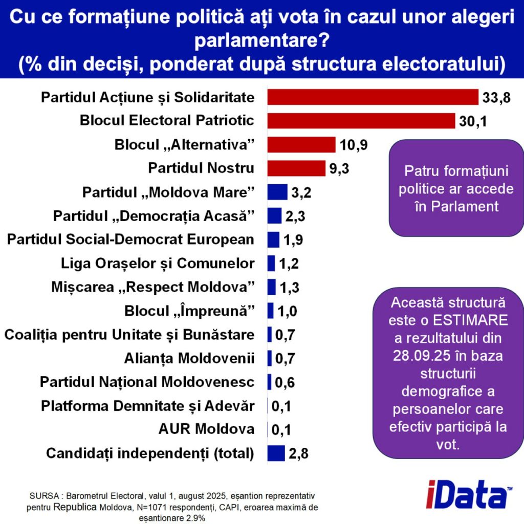В случае проведения парламентских выборов, в новый состав Парламента пройдут четыре политические силы — свидетельствуют данные опроса, представленного сегодня компанией «iData».