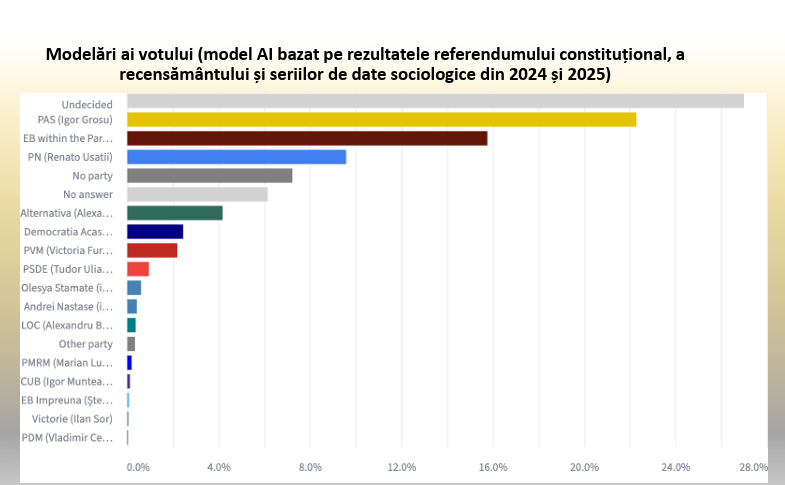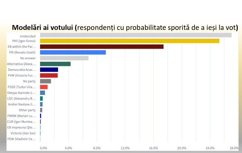 Сообщество WatchDog.MD и Центр социологических исследований CBS Research представили результаты опроса общественного мнения, проведённого в контексте парламентских выборов, назначенных на 28 сентября. Согласно исследованию, если бы выборы состоялись в ближайшее воскресенье, в парламент прошли бы три политические силы. При этом доля неопределившихся избирателей составляет почти 27%.
