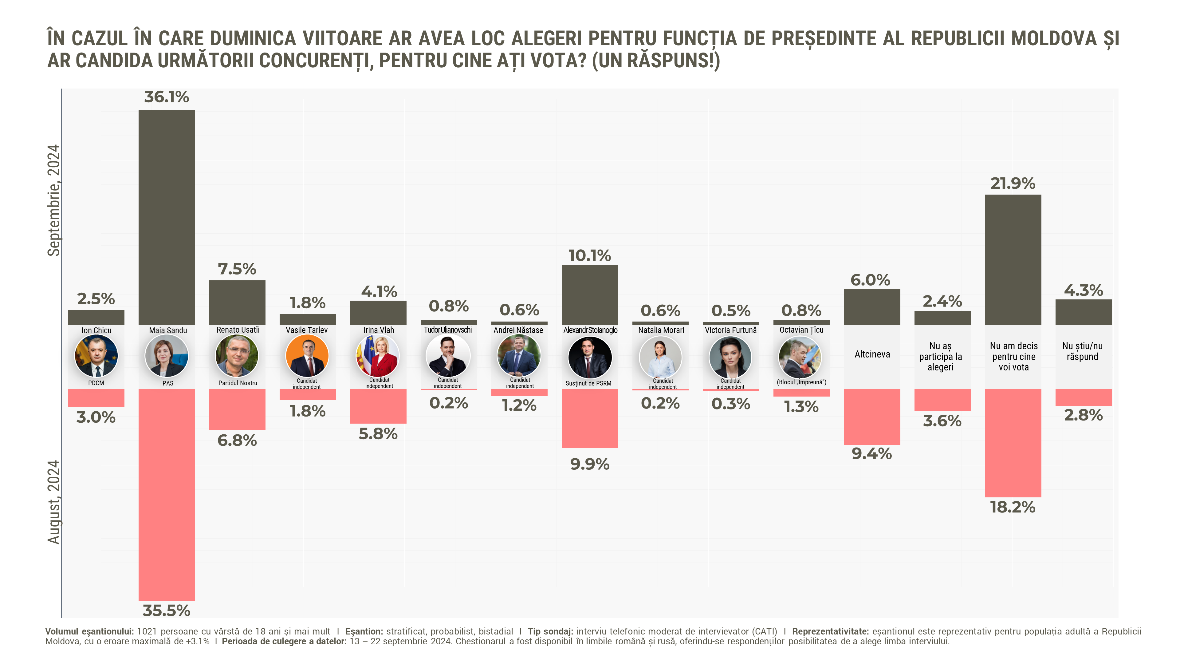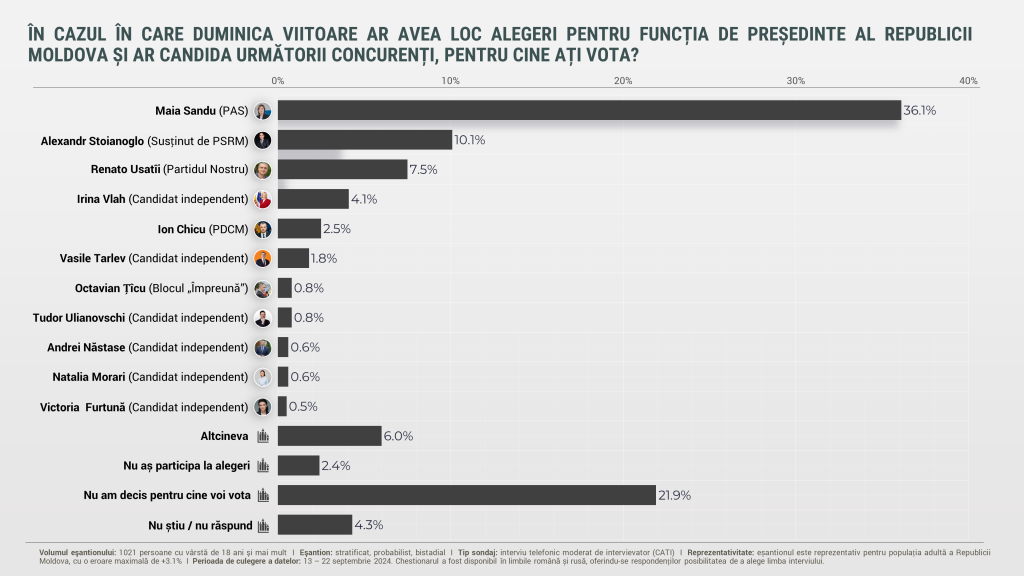 Уточняем, что опрос был проведен Центром Социологических Исследований и Маркетинга «CBS-Axa» по заказу Аспенского Института Румынии, Ассоциации Внешней Политики (APE) и Сообщества «WatchDog.MD» — в период с 13 по 22 сентября 2024 года на выборке из 1021 респондента. Доля погрешность составляет +3,1%