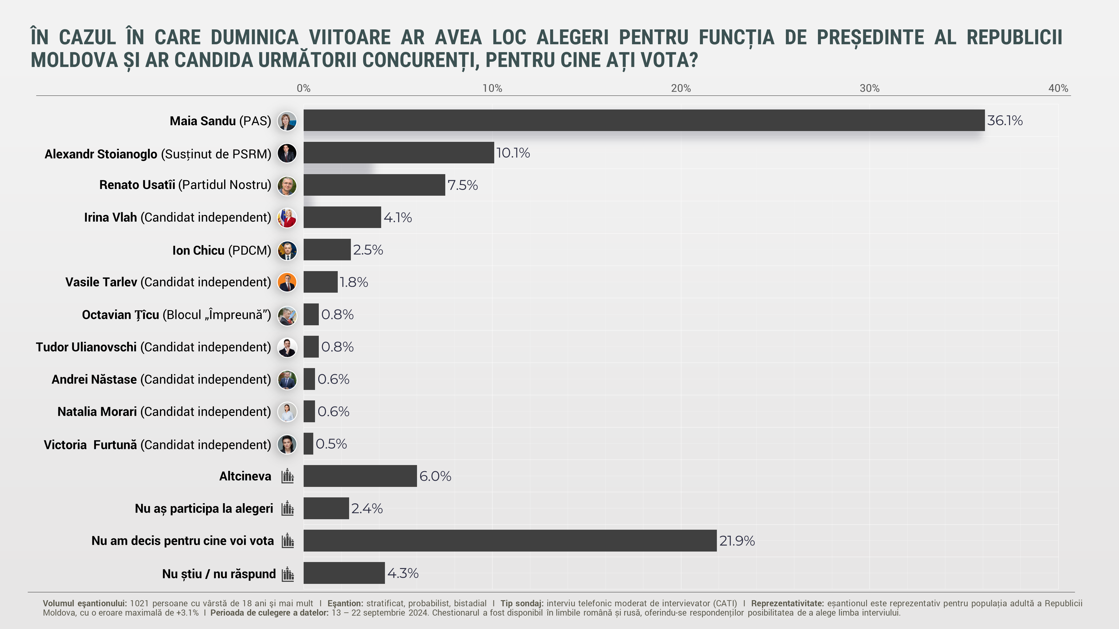 Если бы в ближайшее воскресенье состоялись президентские выборы, никто бы не одержал победу с первого тура. Нынешний президент Майя Санду получила бы 36,1% —свидетельствуют результаты опроса, опубликованного Watchdog.MD.