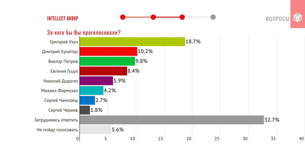 Лидерами опросов остаются, Г. Узун (18,7%) и Д. Кройтор (10,2%) поддержаны популярными в регионе политиками И. Додоном и И. Влах, что ставит их в более выгодное положение. Однако сократился до минимума отрыв с кандидатами В. Петровым (9,8%) и Е. Гуцул (8,4%). Оба кандидата за последнюю неделю совершили скачок в 5%.
