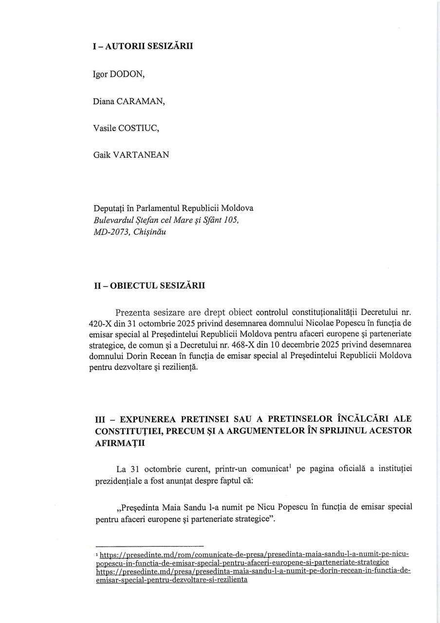 Руководители 4 парламентских фракций – ПСРМ, ПКРМ, «Демократия дома» и «Альтернатива» – подали обращение в Конституционный суд с требованием признать неконституционными указы президента о назначении Николае Попеску и Дорина Речана специальными эмиссарами, поскольку такая должность не предусмотрена законом.