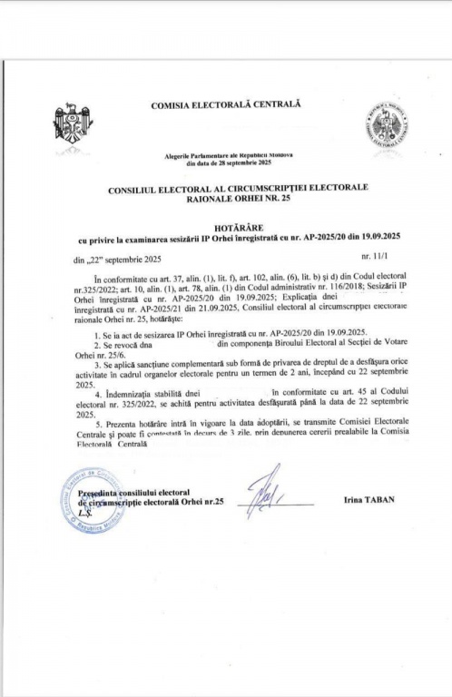 Примар муниципия Оргеев Татьяна Кочу обвиняет Районную избирательную комиссию Оргеевского округа, учрежденную Центральной Избирательной комиссией, в открытом нарушении закона, а именно в безосновательном исключении представителей, назначенных примэрией, из участковых избирательных бюро.