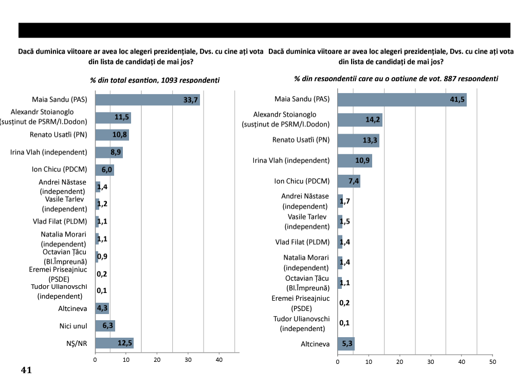 Если бы в ближайшее воскресенье состоялись президентские выборы, 33,7% проголосовали бы за нынешнего президента, Майю Санду — согласно данным опроса, представленного сегодня Компанией IMAS.