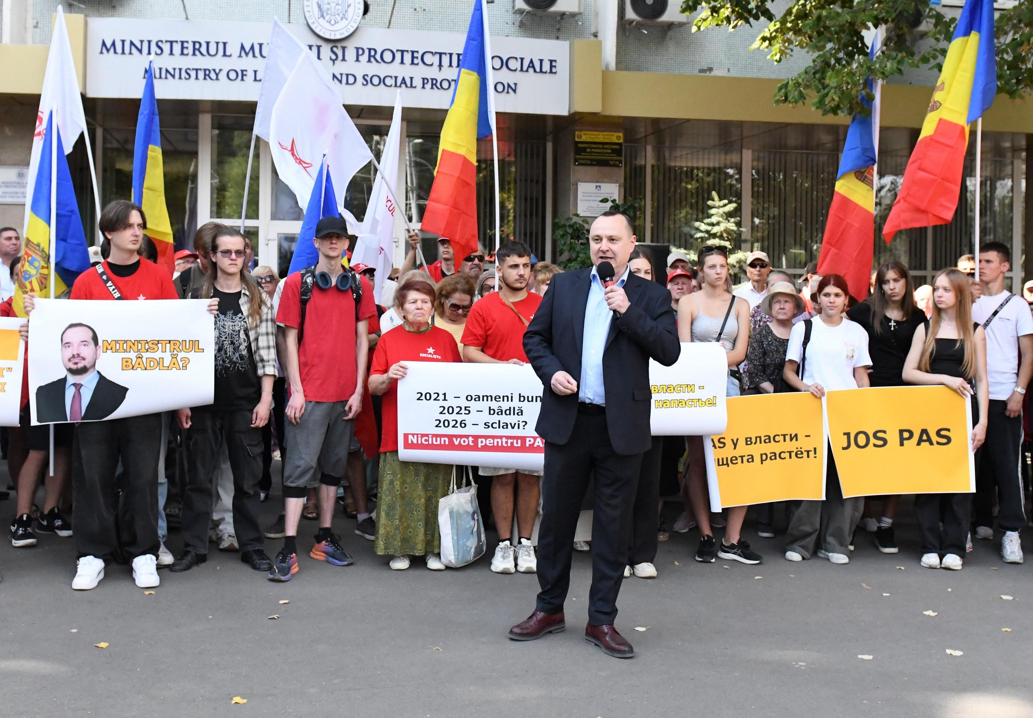 Сегодня ПСРМ организовала акцию протеста перед зданием Министерства труда и социальной защиты, требуя отставки министра Алексея Бузу. Поводом для акции стали оскорбительные высказывания министра в адрес граждан и политика министерства, которая привела к обнищанию населения и его массовому оттоку.