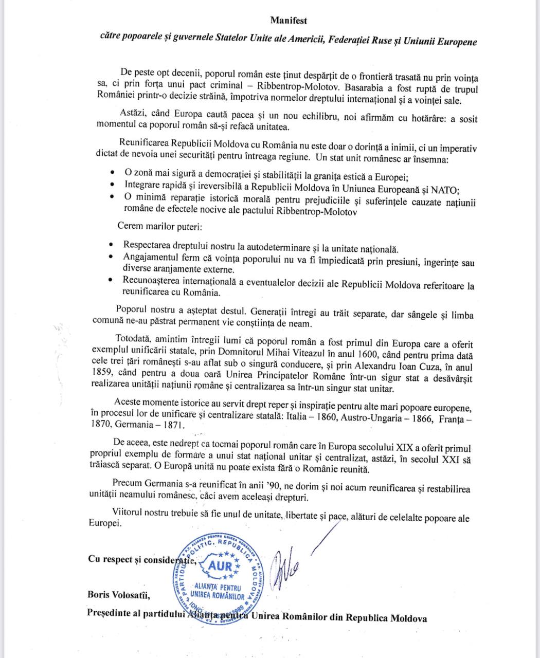 Scrisori oficiale la SUA, Rusia și UE: AUR din Republica Moldova cere recunoașterea dreptului la unitate națională