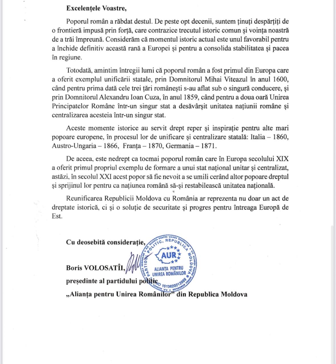 Scrisori oficiale la SUA, Rusia și UE: AUR din Republica Moldova cere recunoașterea dreptului la unitate națională