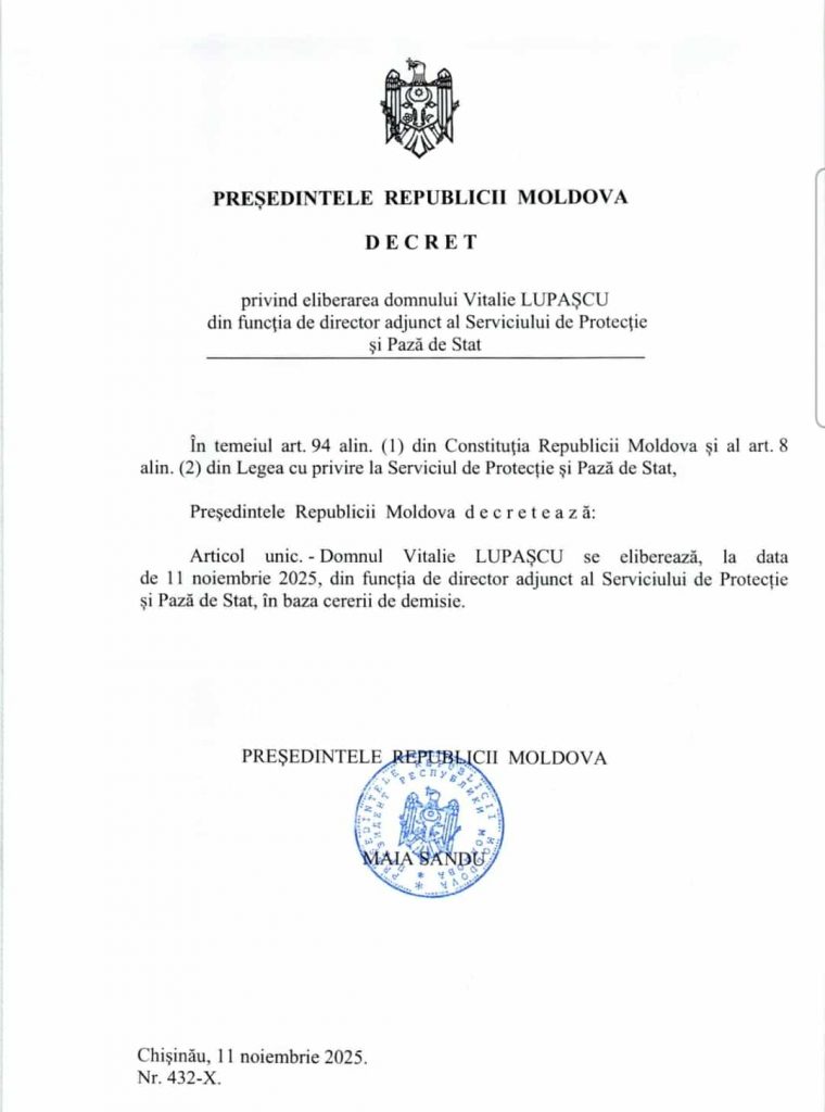 12 noiembrie 2025 În Actual, Important Serviciul de Protecție și Pază de Stat a rămas fără șefi Serviciul de Protecție și Pază de Stat a rămas fără șef. Prin decret prezidențial, Vasile Popa a fost eliberat din funcția de director al SPPS. Printr-un alt decret, Vitalie Lupașcu a fost eliberat din funcția de director adjunct al SPPS. Share Tweet Share