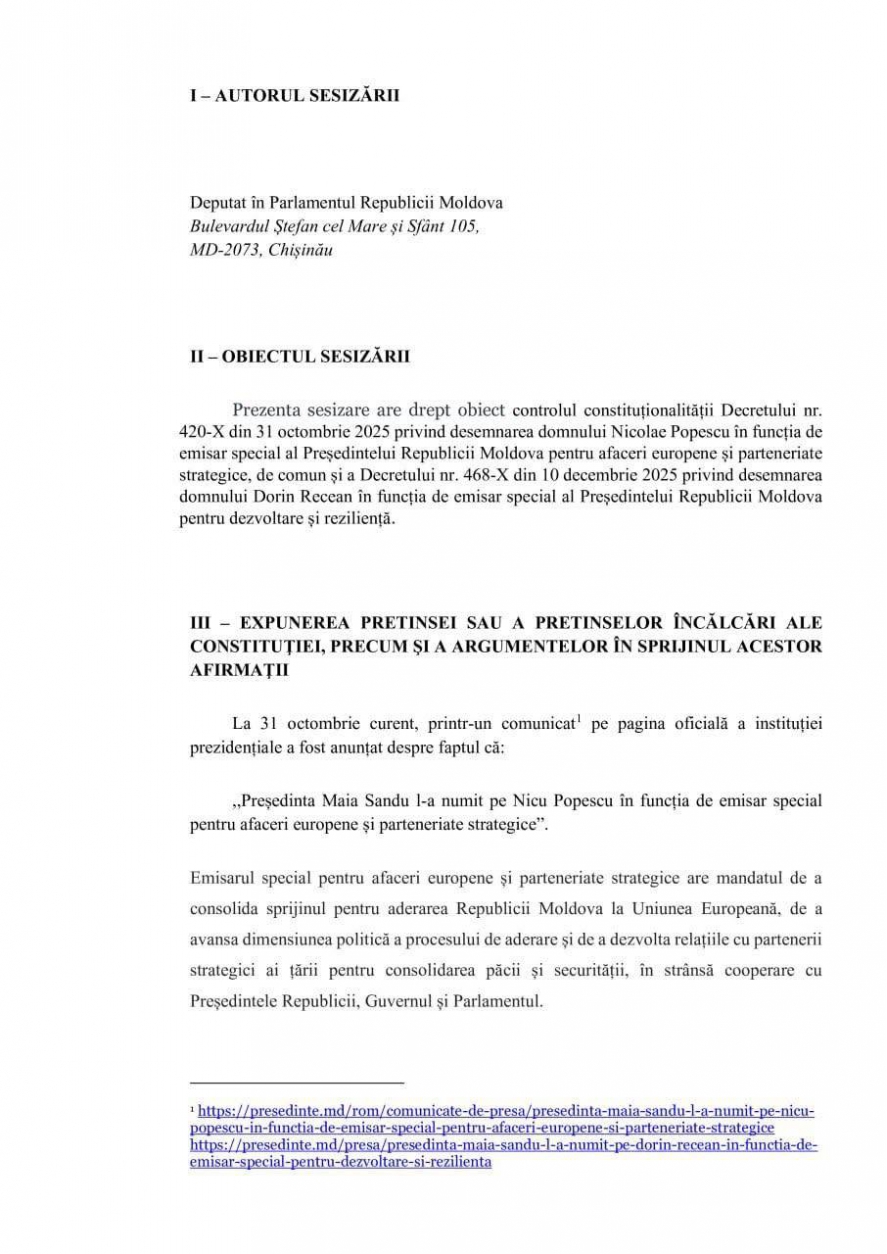 Partidul Socialiștilor din Republica Moldova (PSRM) a sesizat Curtea Constituțională pentru verificarea constituționalității decretului prezidențial pe instituirea funcției de „emisar special”. Liderul partidului, Igor dodon, a menționat că „recent, Președintele Republicii Moldova a instituit, prin decret, funcția de „emisar special pentru dezvoltare și reziliență”. La prima vedere, pare o inițiativă acceptabilă. În realitate, însă, aceasta ridică probleme serioase de legalitate și constituționalitate”.
