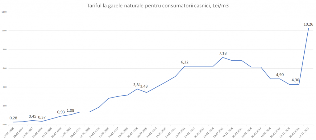 În 1998 tariful a crescut cu 72%, de la 0,37 la 0,64 lei pentru un metru cub de gaz. Atunci creșterea tarifelor a fost determinată exclusiv de deprecierea leului, care în 3 luni sa devalorizat de 1,7 ori față de dolar. Astfel prețul recalculat în dolari pentru gazele naturale a rămas neschimbat.
