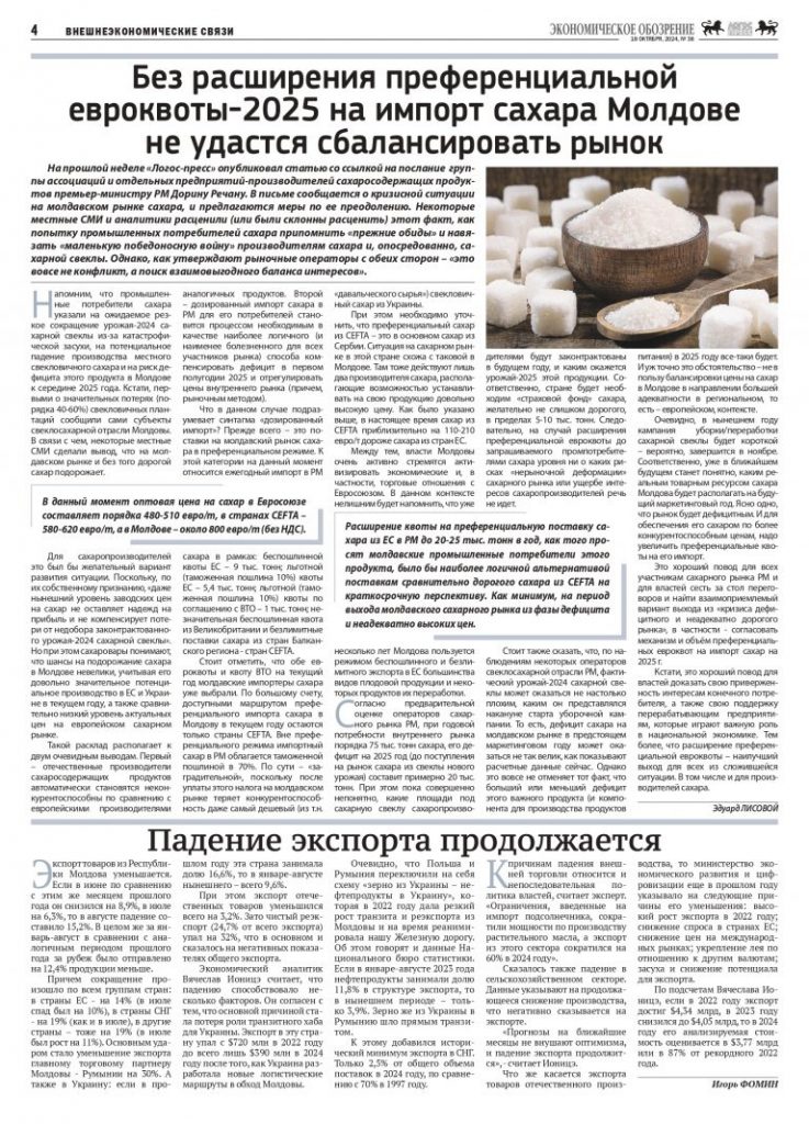 Săptămâna trecută, Logos a publicat un articol cu referire la o scrisoare a unui grup de asociații și întreprinderi producătoare de produse ce conțin zahăr către Prim-ministrul Republicii Moldova, Dorin Recean. Autorii scrisorii s-au referit la situația de criză pe piața zahărului din Moldova și au propus măsuri pentru depășirea acesteia. Unele surse mass-media și analiști locali au considerat (sau au înclinat să considere) acest fapt ca o încercare a consumatorilor industriali de zahăr de a-şi aminti despre „nemulțumirile anterioare” și de a impune un „mic război victorios” producătorilor de zahăr și, indirect, celor de sfeclă de zahăr. Cu toate acestea, așa cum susțin operatorii de piață de ambele părți, „acesta nu este deloc un conflict, ci o încercare de identificare a unui echilibru de interese reciproc avantajos”.