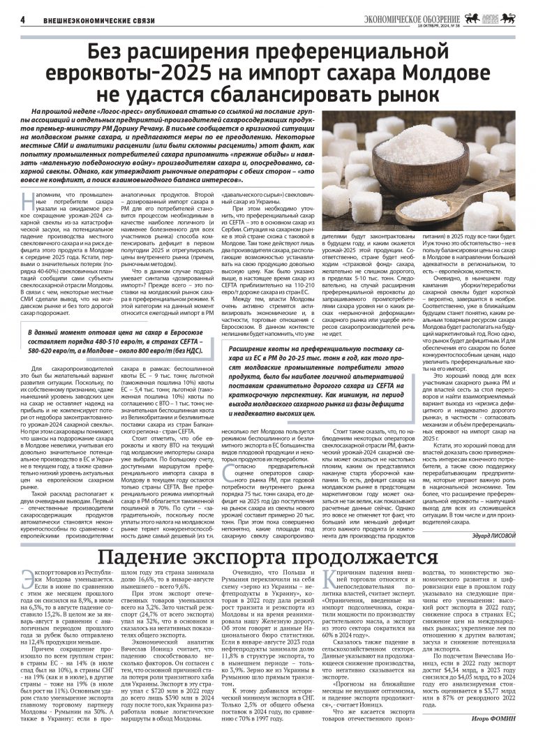 Evident, anul acesta campania de recoltare/procesare a sfeclei de zahăr va fi scurtă – probabil că se va încheia în noiembrie. În consecință, în viitorul apropiat va deveni clar care e resursa reală de zahăr pe care o avea Moldova în următorul an de marketing. Un lucru este clar că pe piață va fi deficit și pentru a asigura prețuri mai competitive este necesară creșterea cotelor preferențiale la importurile de zahăr. Acesta este un motiv serios ca toți participanții la piața zahărului din Republica Moldova și autoritățile să se așeze la masa de negocieri și să găsească o soluție reciproc acceptabilă pentru „criza deficitului și a preţurilor neadecvat de mari de pe piaţă”, în special – să convină asupra mecanismului și volumului cotelor europene preferențiale pentru importurile de zahăr în 2025. Apropo, aceasta e şi o bună oportunitate pentru autorități de a-și dovedi ataşamentul față de interesele consumatorului final, precum și sprijinul pentru întreprinderile de procesare, care joacă un rol important în economia naţională. Mai mult, extinderea euro-cotei preferențiale este o bună ieșire din situația actuală pentru toţi, inclusiv pentru producătorii de zahăr.
