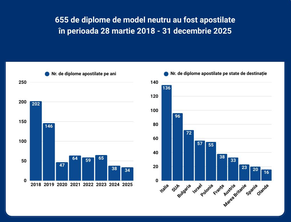 Pe parcursul a aproape 8 ani (28 martie 2018-31 decembrie 2025), în conformitate cu prevederile legislației în vigoare și a celor agreate prin Decizia protocolare „Cu privire la aplicarea apostilei pe actele de studii din regiunea transnistreană” din 25 noiembrie 2017, autoritățile naționale competente au aplicat apostila Republicii Moldova pe 655 de diplome de model neutru ale căror posesori sunt tineri din regiunea transnistreană.