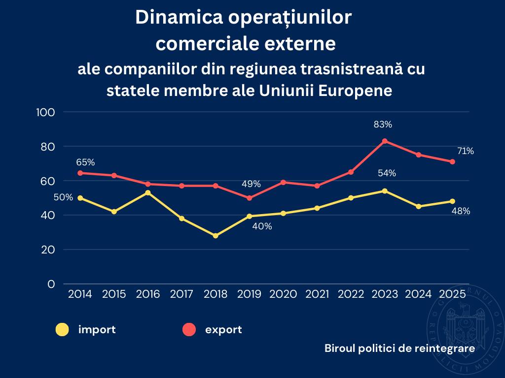 În anul 2025, agenții economici din regiunea transnistreană a Republicii Moldova au continuat să desfășoare activități de comerț exterior preponderent cu statele membre ale Uniunii Europene (UE).