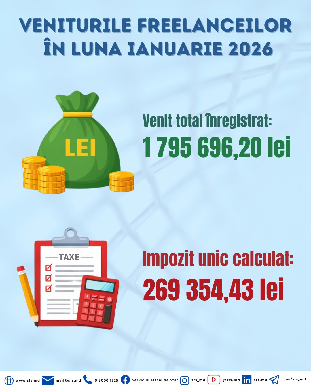 Atenționăm că, 25 februarie 2026 este termenul de plată a impozitului unic pentru persoanele fizice care desfășoară activitate independentă (freelanceri) pentru luna ianuarie 2026.
